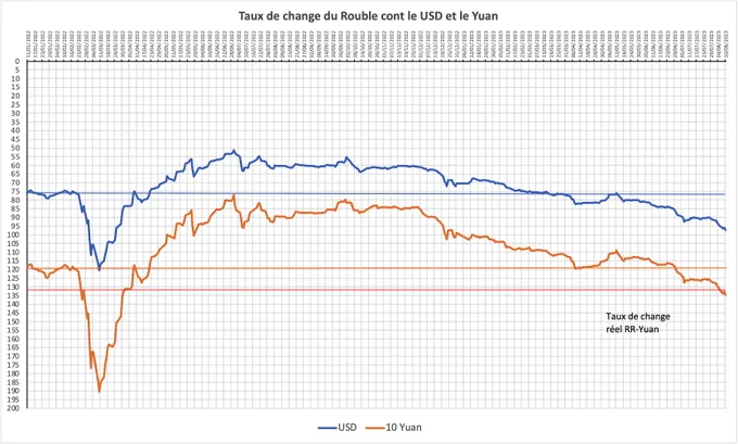 A Rússia tendo se desalavancado amplamente em USD, a queda nominal da taxa RR/USD não tem mais consequências, mesmo que aumente o custo da compra de certos serviços que são feitos em USD (frete marítimo em particular) .